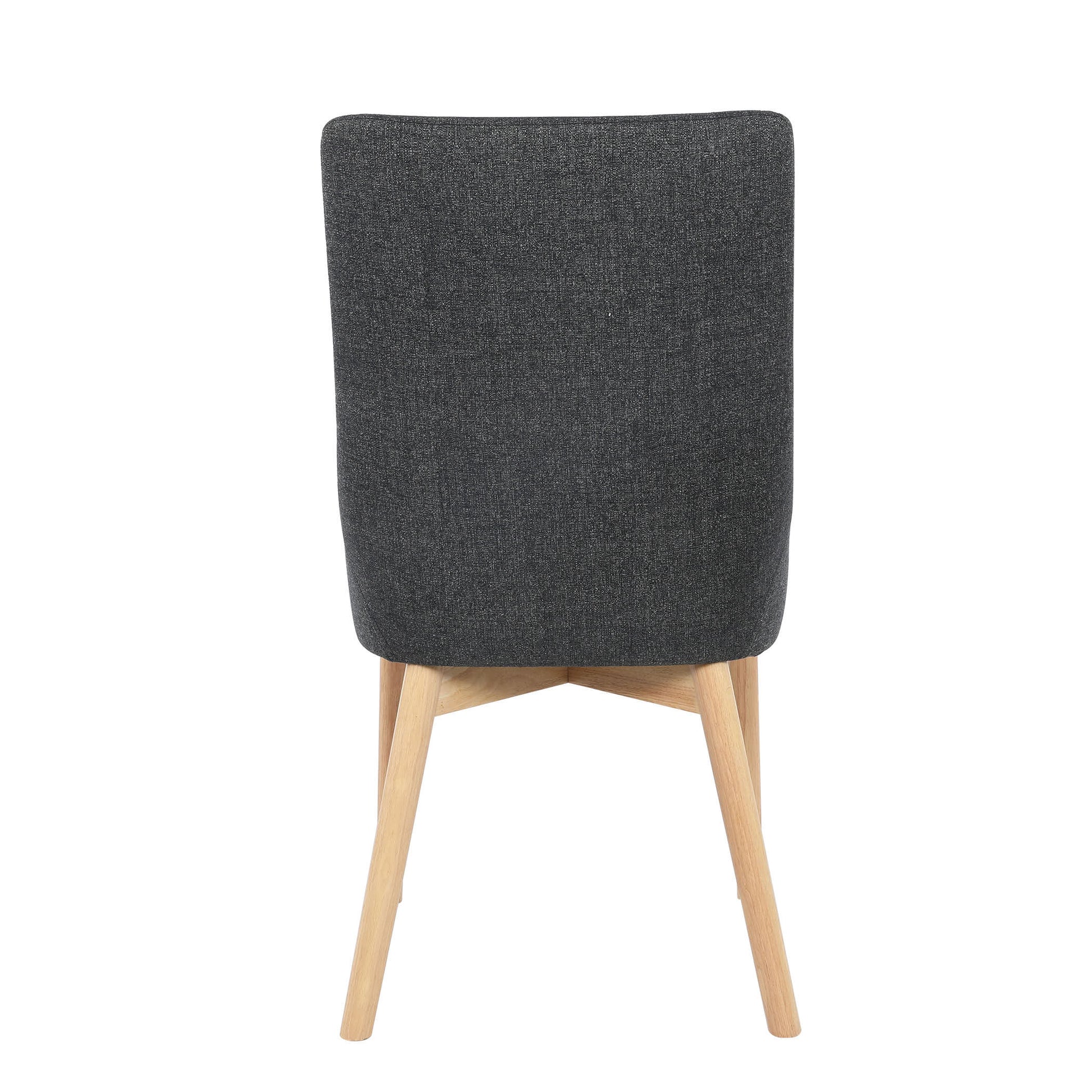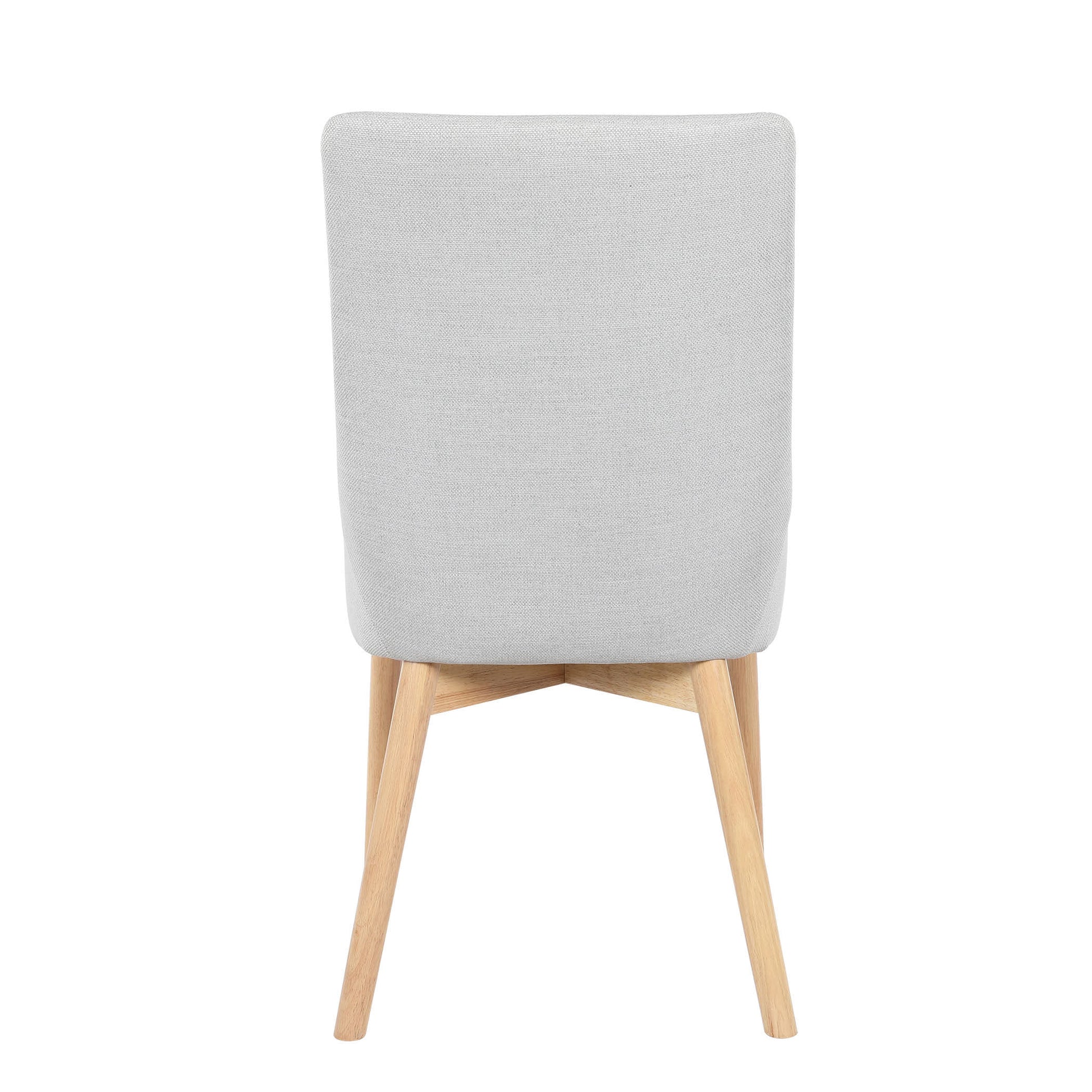 The seat is upholstered in fabric with cushioned padding, providing comfortable support for regular dining. A supportive ergonomic backrest helps maintain comfort during longer sittings, while the solid timber legs offer reliable stability and a natural contrast to the silver-grey upholstery. The overall design remains simple and practical, focusing on comfort and durability rather than unnecessary detail.