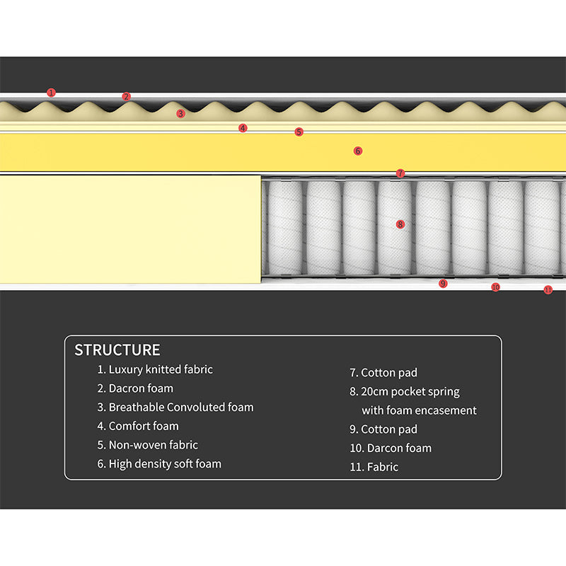 - 20cm 3-zone pocket spring system with 1.8–2.0–1.8mm wire diameter for targeted ergonomic support