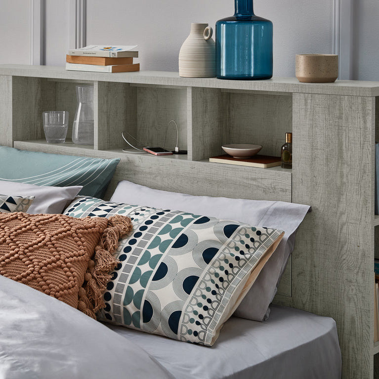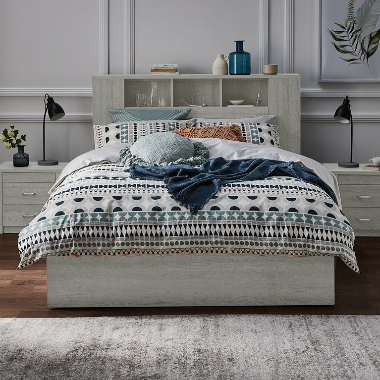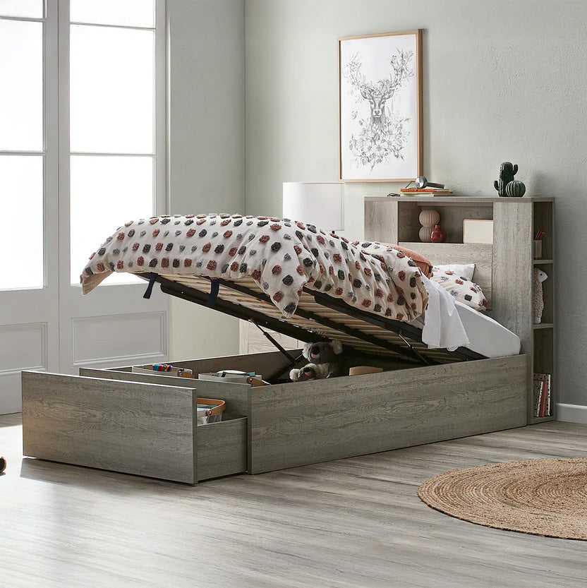 Featuring statement shelving at the front and sides of the headboard, this design allows you to create your own personal bedroom library or showcase decorative pieces. Practical storage is seamlessly integrated throughout the bed, including a concealed pull-down drawer within the headboard, a spacious drawer in the base, and a gas lift storage compartment — perfect for storing bedding, toys, games, and everyday essentials.