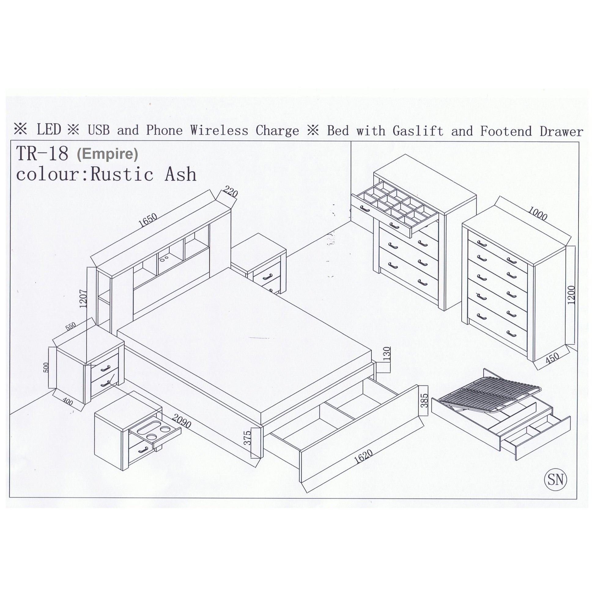 - Queen: W 1650 × L 2310 × H 1210 mm