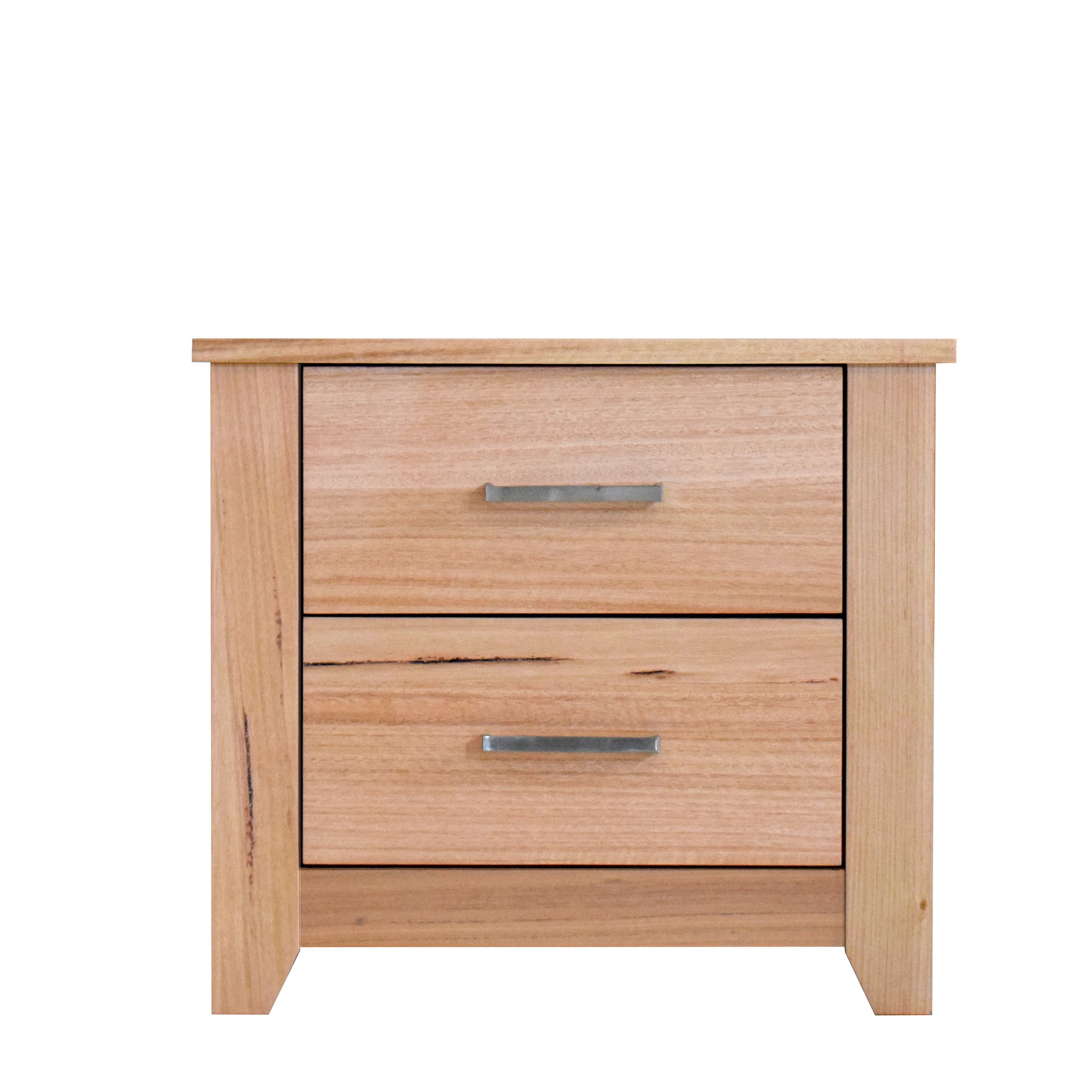 Constructed from Messmate timber veneer over an engineered wood frame, this bedside table highlights the natural grain and warmth of the timber while remaining durable for everyday use. The two-drawer layout provides convenient storage for night-time essentials, helping keep the bedroom organised without adding visual clutter.
